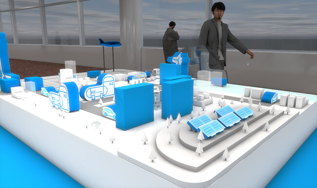 〇未来の羽田エリアをイメージしたジオラマ(模型)で、水素を「つくる」「ためる」「はこぶ」「つかう」の流れが学べます!