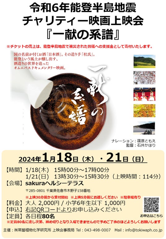 株式会社常磐植物化学研究所は、被災者の皆様を支援するため、令和6年1月18日(木)および1月21日(日)の2日間、チャリティー映画上映会を開催いたします。チケットの売り上げは全額、支援団体へ寄付いたします。