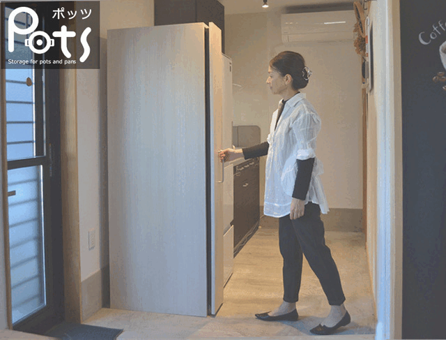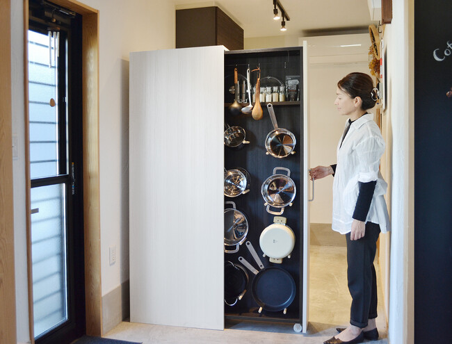 必要な鍋・フライパンを一目で探せるディスプレイ型収納。キッチンの作業のストレスが解消されます。