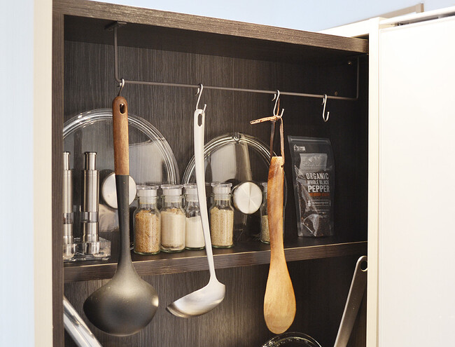 上部の棚にはスパイスなどを収納。棚の奥の25mmのスキマに大型の鍋蓋を挟んで収納可能。ハンガーバーにはトングやレードルなどを吊るして収納できます。