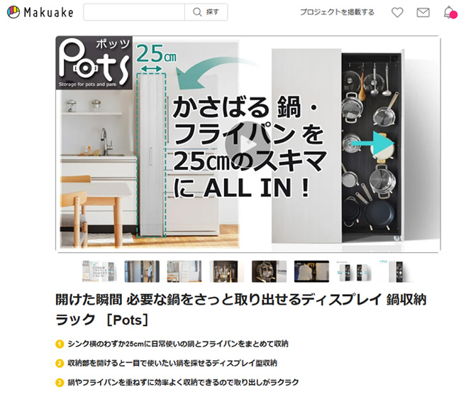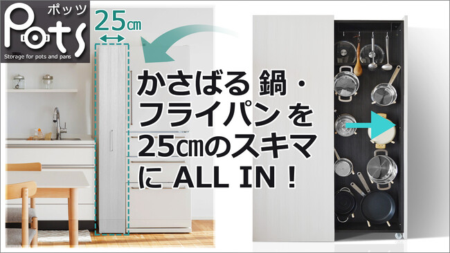収納場所に困る鍋やフライパン。シンク下に積み重ねてしまうと必要な鍋を取り出すのに大変...鍋やフライパンを引き出しにしまっておくと収納効率が悪く場所をとってしまう...そんなお悩みを解決する、シンクや冷蔵庫横のわずか25cm幅の空間に日常使いの鍋やフライパンをディスプレイしてしまえる鍋・フライパン収納すきまラック[Pots]を開発しました。鍋・フライパン収納ユニットはキャスターで力を入れずに女性でも楽に引き出せ、必要な鍋・フライパンが一目で探せます。
