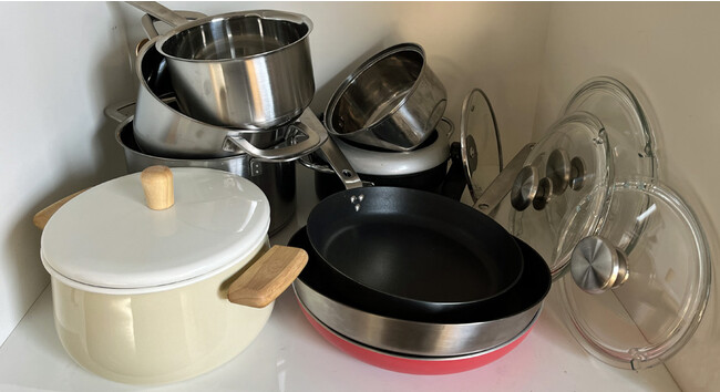 シンク下などに積む重ねて収納された鍋とフライパン...必要なものを探すのも取り出すのも一苦労。