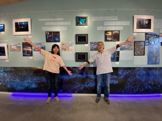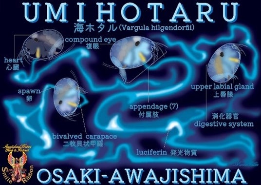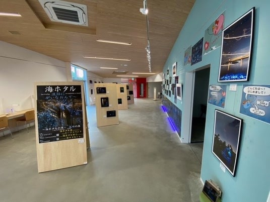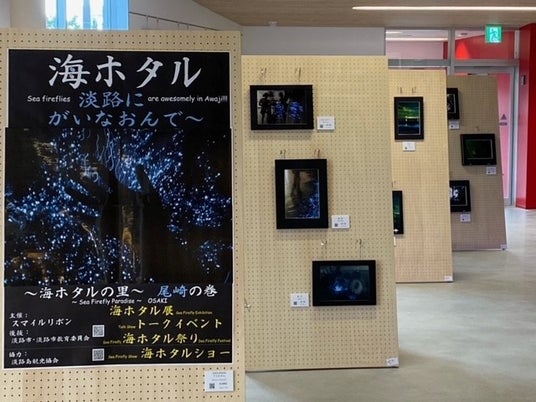 なお、海ホタルショーは、7月から9月に開催されますが、それに先立ち、6月1日(土)より6月30日(日)まで、淡路市立津名図書館にて、「海ホタル展」(無料)が開催されています。スマイルリボンサポーターのカメラマンや参加者が撮影した神秘の世界に誘う画像が、本番のツアーへの期待感を膨らませてくれます。また、開催中の6月23日(日)と、29日(土)の2日間は、ショーのメインガイドの竹谷富士子さんと演出を務める海中生物ガイド歴25年のムーサフルさんによるトークイベントが、10時30分より11時15分まで開催されます。(無料・先着20名)