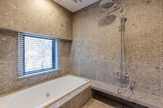 洗面所と一体型の広々とした空間であり、スイートルームのバスのようなタイルで統一されたデザインが特徴です。高級感あるグローエのシャワーセットが設置され、窓からは美しい眺望を楽しむことができます。洗練された空間でありながらリラックスできる、贅沢なバスタイムを提供します。