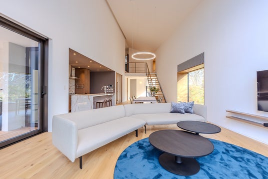 リビングルームの天井高6.2mの吹き抜けは、広々とした空間全体をカバーし、訪れる方を圧倒します。天井まで届く大迫力の薪ストーブの煙突と天然石仕上げの炉壁が印象的で、大型窓から差し込む柔らかな陽光が空間を満たし、心地よい明るさを生み出しています。