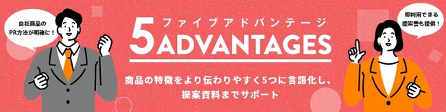 「5ADVANTAGES」は、テレビ通販会社のツボを心得たプロの手により、セールスポイントの言語化、通販会社に即提案できる提案書まで作成して、1商品につき50万円でご提供します。商品のこだわりやPRポイントだけでなく、なぜこの商品を作ったのか?原点まで振り返り、商品の良さを5つに言語化して再定義します。