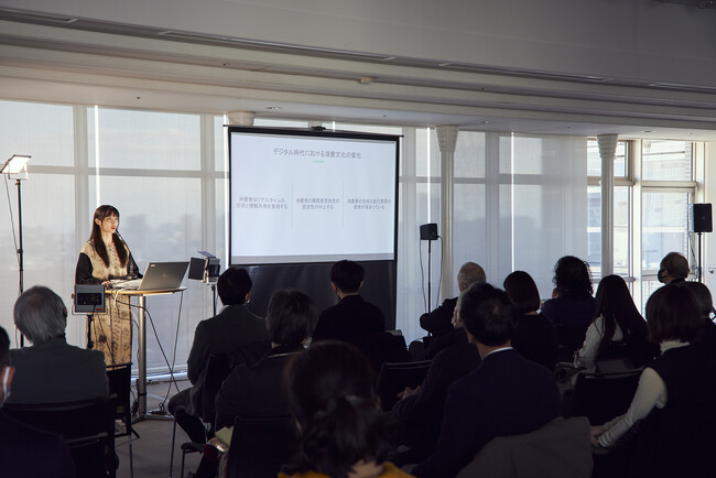 ファッション経営管理コースでは、院生各自がファッションマネジメント分野に関するテーマをそれぞれ設定し、修了研究プロジェクトとして論文形式や事業計画書形式で執筆します。その研究内容をまとめた代表者によるプレゼンテーションを行います。