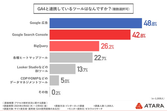 さらに「GA4と連携しているツールはなんですか?」と質問したところ「Google 広告」が48.8%で最も高く、「Google Search Console(サーチコンソール)」が42.8%、「BigQuery」が26.2%、「各種ヒートマップツール」が22.7%、「Looker StudioなどのBIツール」が13.7%、「CDPやDMPなどのデータマネジメントツール」が5.0%と続きます。約半数の人が「Google 広告」と回答したことから、Google 広告のパフォーマンスを確認している人が多いことが明らかになりました。