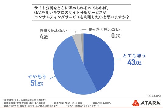 最後に「サイト分析をさらに深められるのであれば、GA4を用いたプロのサイト分析サービスやコンサルティングサービスを利用したいと思いますか?」と質問したところ、「とても思う」が43.0%、「やや思う」が51.8%、「あまり思わない」が4.9%、「まったく思わない」が0.3%という結果になりました。「とても思う」(43.0%)と「やや思う」(51.8%)の回答を合わせると94.8%で、9割を超える人がGA4を用いたプロのサイト分析サービスやコンサルティングサービスを利用したいと思っていることが分かりました。