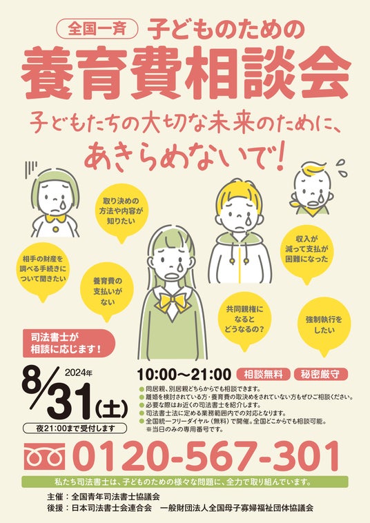 全国青年司法書士協議会(所在地:東京都新宿区、会長:坂田亮平)は、「全国一斉子どものための養育費相談会」を2024年8月31日(土)10:00~21:00に開催いたします。