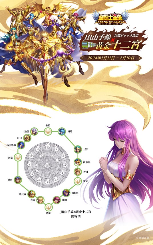 『星矢ジャスティス』は、1月8日から1月21日まで首都圏&大阪の20駅にて大規模なジャック広告を展開しています。全60種類以上となっています。池袋駅には、青銅聖闘士VS黄金聖闘士の戦闘シーンが描かれたポスターが登場!聖闘士星矢の世界に浸ることができる『星矢ジャスティス』ならではのイラストを楽しむことができますので、以下の駅にお立ち寄りの際はぜひご覧ください。