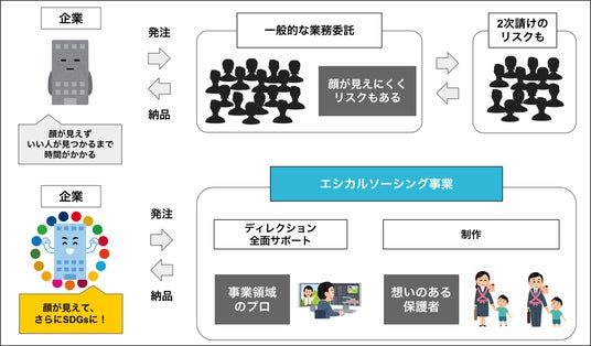 エシカルソーシング事業は、従来のような単なる案件の受発注を行うソーシングサービスと異なり「発注することがSDGsに繋がる」新たな社会課題解決の枠組みです。