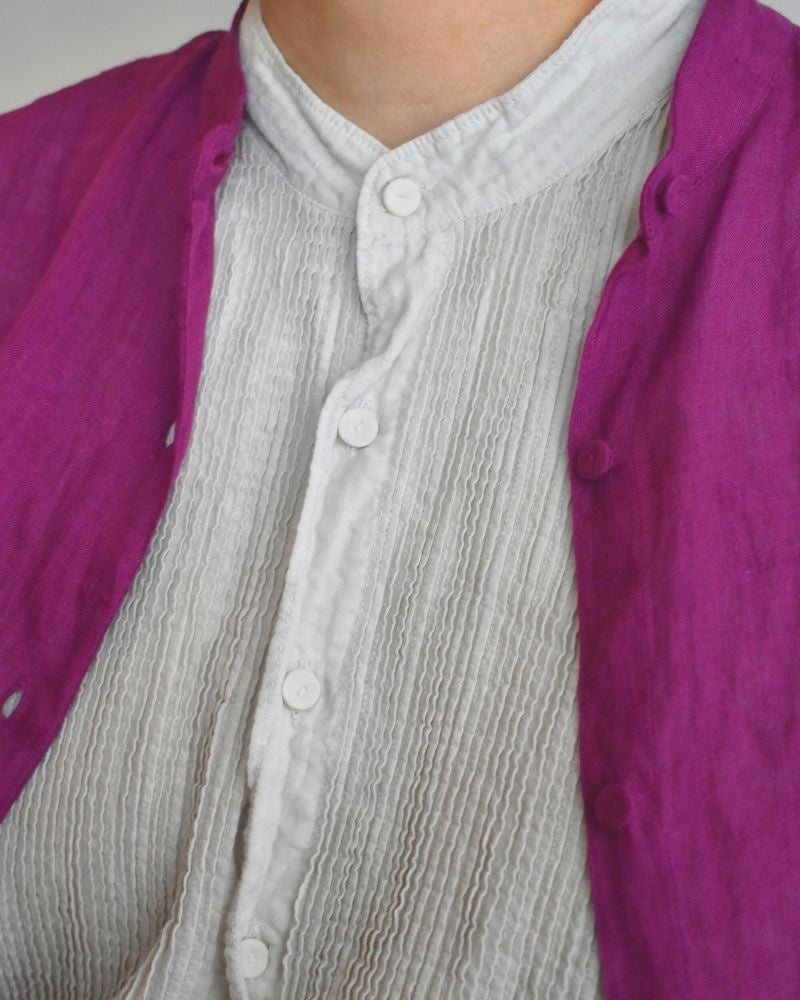 2種類の80番手のオーガニックコットン生地(ドビーチェックとシアサッカーチェック)を前後身頃につかい、無数のピンタックも施されています。熟練の職人さんにより施されたピンタックは、技術の高さと手仕事の温もりを感じさせてくれます。