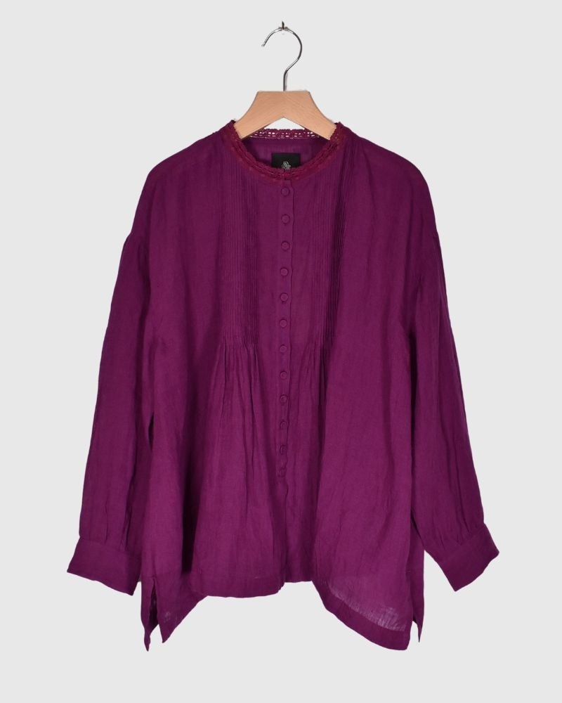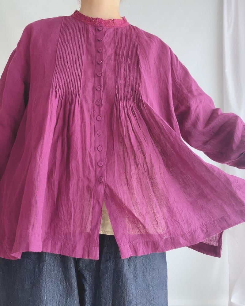 80'S POWER LOOM LINEN PLAIN LACE COLLAR PINTUCK SHIRT。天然素材リネン100%です。