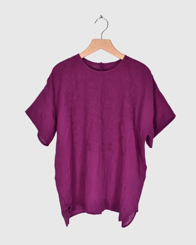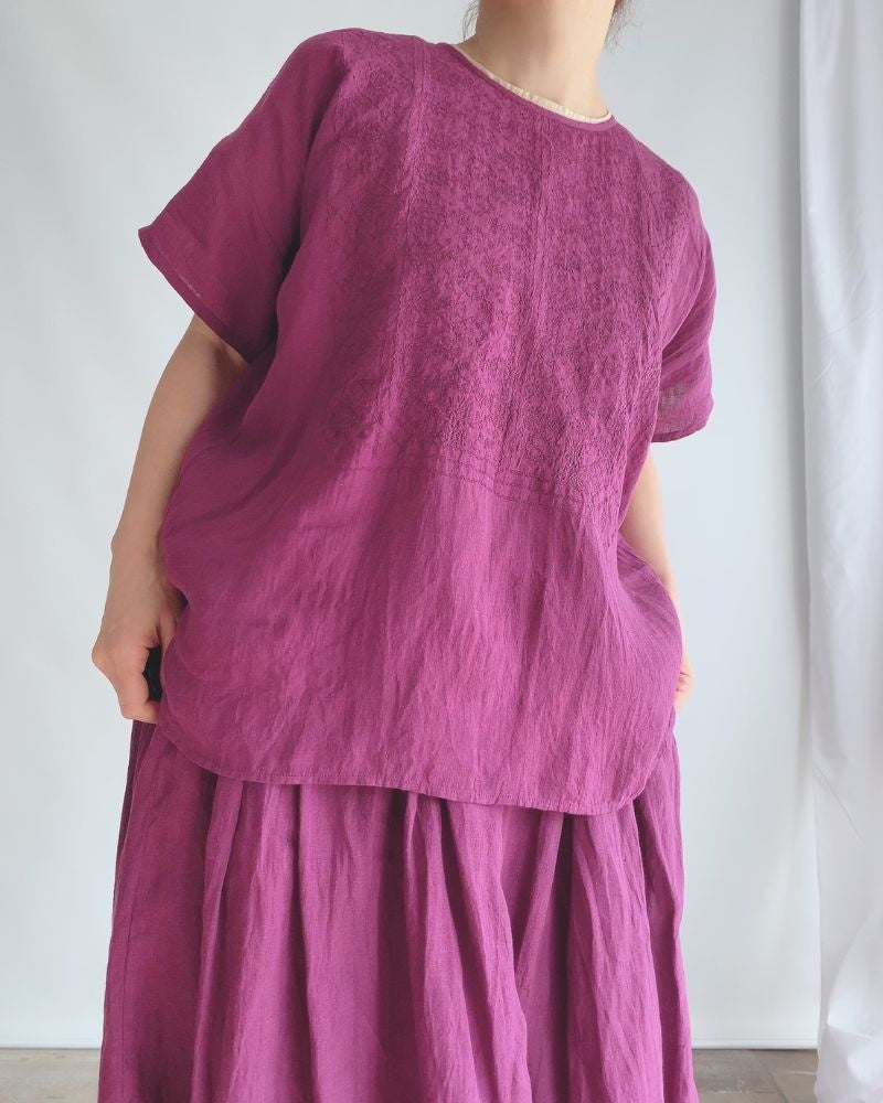 前身頃に花や幾何学模様の繊細な刺繍が施された半袖クルーネックシャツです。胸元の刺繍は職人さんが一枚一枚、手で生地を回しながら絵を描くようにミシンで刺繍を施す"手振り刺繍"です。