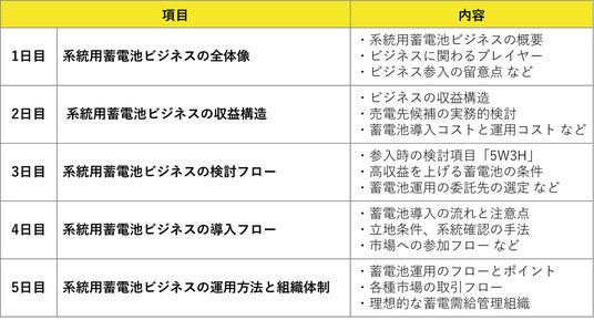 □「5日間でわかる系統用蓄電池ビジネス」の内容