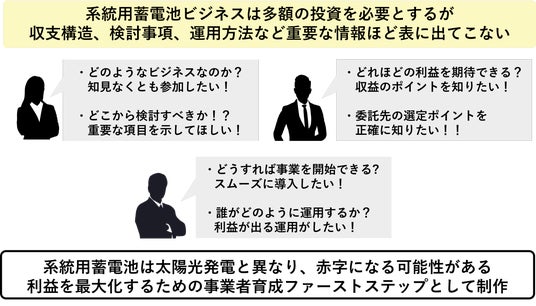 一方で、系統用蓄電池ビジネスは発電ビジネスよりモデルや収益の構造をイメージし難いことも否めません。「系統用蓄電池ビジネスは具体的に何をするビジネスなのか見当もつかない」「系統用蓄電池ビジネスは発電ビジネスよりも難しくノウハウを豊富に供えないと手を出すことができない」など、参入に二の足を踏む企業が少なくないのです。日本は脱炭素の推進、エネルギーコストの低減などの課題を解決するために、再生可能エネルギーの導入を加速することは間違いありません。太陽光、風力発電という出力が変動する再生可能エネルギーの導入加速への対策として、系統用蓄電池のニーズは高まることでしょう。発電と電力小売の側面を併せ持つ系統用蓄電池ビジネスは、エネルギー事業者だけでなく、新規参入者にとって大きな利益をもたらす機会を与えることでしょう。