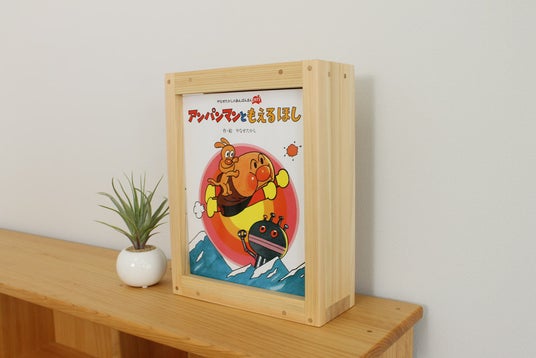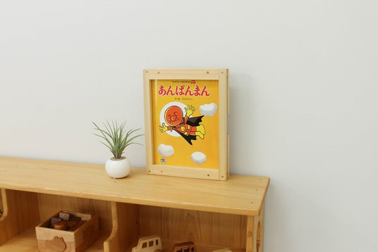 「かざれるき」えほんフレーム(絵本6冊用)アンパンマンの絵本全6冊が収納できる絵本フレーム。どしっと重厚感がある木製のフレーム。毎日表紙を差し替えて気分を変えられる。そのまま本棚に収納できるのもポイント。