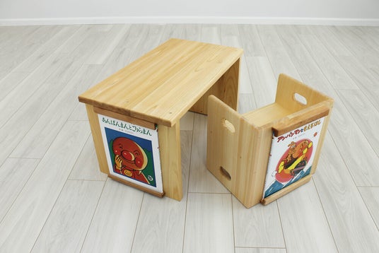 「かざれるき」えほんチェア×テーブル(絵本3冊セット)絵本は【アンパンマンヒーロー誕生セット3冊】または【アンパンマンワールドの仲間たち3冊】から選ぶことができる。椅子の背面やテーブルの側面には絵本1冊が飾れるスペースを設け、毎日子どもたちが機能的に使うことと、絵本を飾れるという2つの用途を兼ねている。