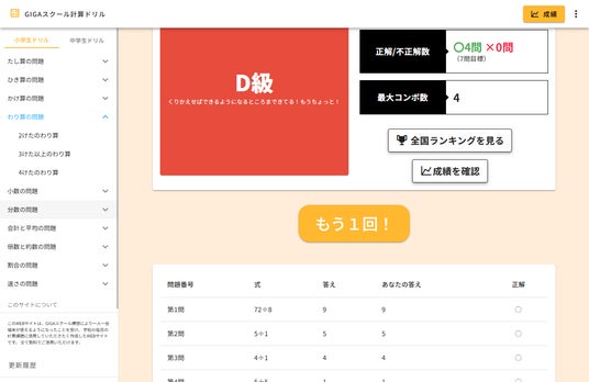 算数・数学をしっかり理解しながら学習していくためにも、反復練習を繰り返して計算力を高めていき、計算で頭のリソースを使いすぎないようにしていくことは重要です。このGIGAスクール計算ドリルは、計算速度や正答率が上がると上のランクを取れるようになったり、全国ランキングで他のユーザーと競えたりと、楽しみながら練習できるようになっているので、ぜひ遊びながら学んでいただければと思います。