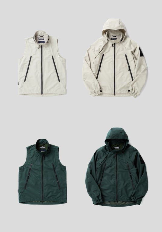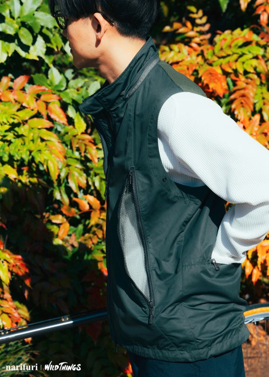 WILD THINGSのアイコンアイテムHAPPY JACKETをベースにnarifuri独自の機能を盛り込んだ2WAYジャケットです。 ベンチレーション機能と脱着機能を融合させた”一体型のフード・袖”を取り外す事でベストとしても着用可能。
