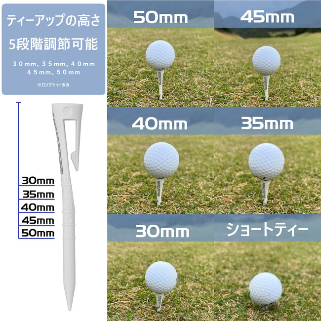 独自の切込み形状により帽子やベルト、スコアカードホルダー、ヘッドカバーなどにクリップできてポケットから取り出す際の煩わしさから解放されます。品質にこだわり日本国内の工場にて生産し、高い耐久性を実現しました。ロングティーには要望の多かった高さ目盛を5段(30mm、35mm、40mm、45mm、50mm)搭載。柔らかい素材で「しなり」が振りぬきの良さに繋がります。