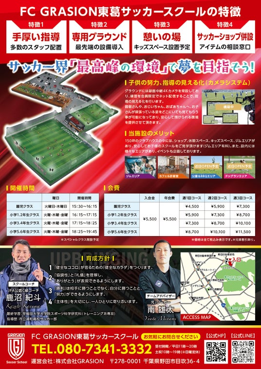 長年のサッカー経験と豊富な知識、スポーツ科学の理論に基づいた指導を基に、一人ひとりのスクール生に「手厚い指導」を心がけていきます。アシスタントとして、FC GRASION 東葛のTOPチーム選手が携わり、スクール生のお手本、相談役としてコミュニケーションを多く取れる体制を整えています。【東葛地区から本気の夢を追いかけるサッカークラブ「FC GRASION 東葛」】