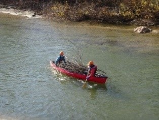 伐採した下草・雑木をカヌーで運搬シロヤナギの木を保全し美しい水没林の景観を維持するため、毎年11月ころに、白川湖岸公園および水没林エリアの下草の除去や、低木・雑木の伐採活動を行っています。