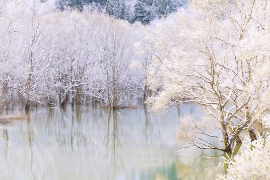 シロヤナギの木々が芽吹く前は湖岸の残雪とともに白に包まれる静寂の世界が広がります。