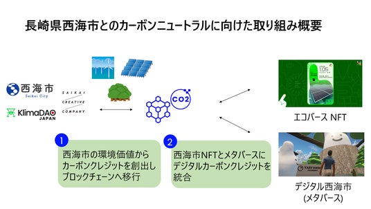 KlimaDAO JAPANは長崎県西海市、および株式会社西海クリエイティブカンパニー(以下、SCC)と連携し、西海市が目指す「ゼロカーボンシティ」に向けた取り組みを開始しています。具体的には、西海市の環境価値からカーボンクレジットを創出し、それらをKlimaDAO JAPANのブリッジングシステムを利用しブロックチェーンへ移行、そしてSCCが開発するNFTやメタバースに、そのデジタルカーボンを統合する計画をしています。