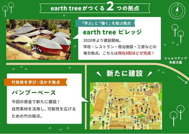 NPO法人earth treeは、カンボジアで貧困課題・教育課題に取り組む団体です。2021年より建設を行なっていたearth tree villageが完成に近づき、竹素材を使ったビジネスや竹建築の可能性が、大きくひろがりました。今回は「竹の技術拠点“バンブーベース”」をつくることで、カンボジアの農村部をはじめとした必要とされる地域へ、竹技術の継承やビジネスの拡大し、地球環境に良い素材で雇用が生まれる仕組みづくりを目的とした資金調達を行いました。