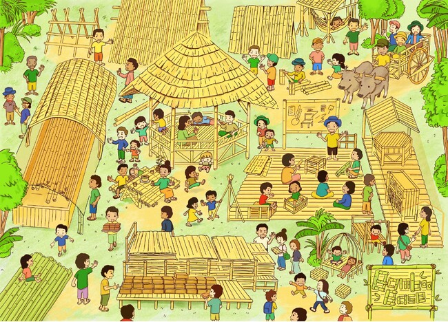2021年より建設をスタートしたビレッジ建設は、2023年度末にメインエリア完成にまで到達いたしました。現在は、工房・学校・フリースクール・カンボジア現地ツアーのメインスポットとして活用されています。今回のバンブーベースは、このビレッジから徒歩1~2分程度の場所に建設されます。