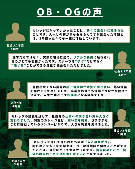また、これまでのヴェルディクラブカレッジでは卒業生の一部が、卒業後もヴェルディの各競技でインターンシップを続けて活躍。さらに、他競技・他クラブへの就職も果たしています。