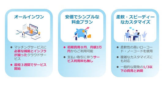 しかしながら、新規参入者がマッチングサービスやシェアリングサービスを一から開発するには、多大な開発費用と長期間の開発期間を要するため、参入障壁が非常に高いのが現状です。