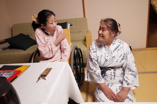 初めての温泉体験。温泉入浴後おかあさまとゆっくり談笑されていました。ご利用者さまとお母さまの頬も温泉のお湯で温められて、ほんのり赤くそまっていました。