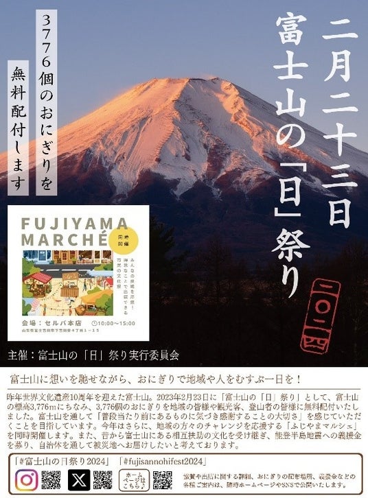 「富士山の『日』祭り」実行委員会では、富士山の、周辺地域を含めたさらなる魅力の発見と発信、社会的・世界的価値の向上、さらにはそこに住まう人や関係する人の喜びを目的とし、2024年2月23日(金・祝)の「富士山の日」を、国指定重要無形民俗文化財であり日本三奇祭とされている山梨県富士吉田市の夏の「吉田の火祭り」にかけて、冬の「日祭り」として「富士山の『日』祭り」と命名し、富士山の標高3,776mにちなんで、3,776個のおにぎりを山梨県と一部静岡県内で地域住民や観光客に無料配布し、富士山を想いながらおにぎりを食べるイベントを、今年も開催いたします。