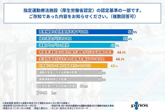 続いて、指定運動療法施設を知っていると回答した65人を対象に、指定運動療法施設の認定基準について知っていることを回答してもらいました。