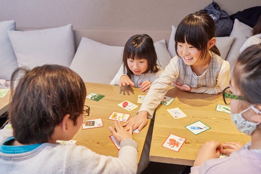 アプリの体験会に合わせ、”もぐみん”が描かれた「もぐもぐタウンかるた」を使って食の豆知識や旬について学ぶ「もぐもぐタウン」かるた体験会も実施しました。食材や栄養に関する読み札が読まれると、その場から立ち上がって絵札を探す様子も見られました。はじめのうちはかるたに夢中になっていましたが、次第に読み札の内容にも意識が向くようになり、エビの漢字表記についての読み札が読まれた時には「エビって“海の老人”って書くんだ」と驚きの声を上げるなど、楽しみながら食や栄養の知識を吸収している様子があちらこちらで見受けられました。