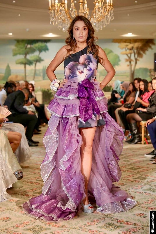 モンテカルロファッションウィークでMAMI OKANOのドレスを着てランウェイを歩くKIKO(elite JAPAN所属)