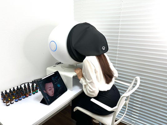 通常の肌診断機とは別に、Hadakanri PERSONAL Al専用の「パノラマAI肌診断システム _EVE-V」を導入。3D撮影が可能となり、25秒で撮影が完了します。その後、 Hadakanri PERSONAL 独自のプログラミングにより、最適解の美容成分がリコメンドされます。AIパノラマ撮影はお客さまの肌診断の精度を飛躍的に高めることができます。