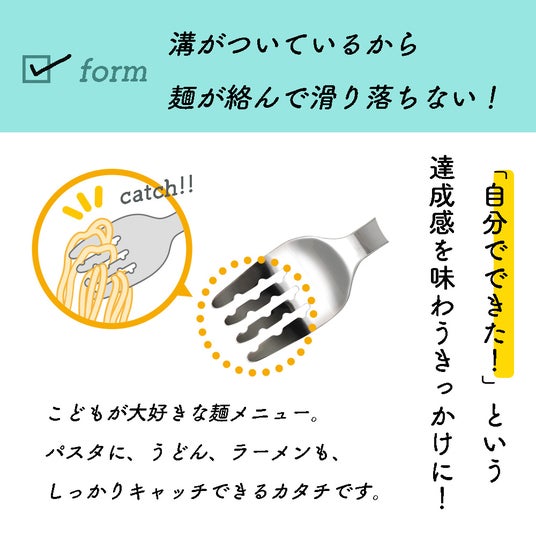 溝がついているため、子どもが大好きなうどんやパスタ、ラーメンもしっかりキャッチ。麺が絡んで滑り落ちにくいところも使いやすい秘密です。