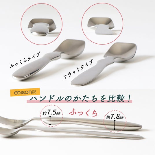 また、スプーンが浅いとスープなど水分の多いものは口に運ぶまでにこぼしてしまうのが心配ですが、EDISONのスプーンは深めの形状だから、しっかりすくえてこぼさず食べることができます。