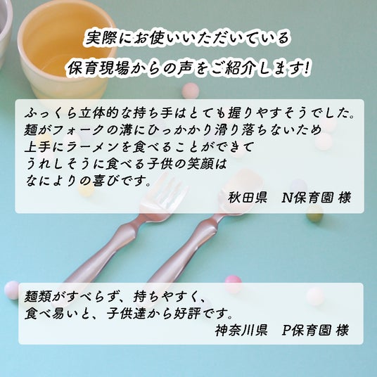 小さなこどもの手への負担を減らし、軽くて使いやすいから毎日毎食使いたくなるカトラリーです。