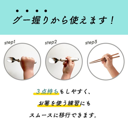 スプーンやフォークを初めて使う2歳くらいの子どもでもグー握りで使うことができ、鉛筆を持つように持つ『三点持ち』もしやすいことから、スムーズにお箸に移行することができます。