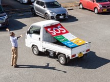 日常時は壁面装飾のほか軽トラックシートとして、発災時は日常時に使っている面を裏返して軽トラックのそばから災害情報を知らせたり、公園やグラウンド、屋上などにシートを移動させたりして、救援情報を上空の救助者へ届けることができます。