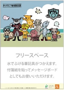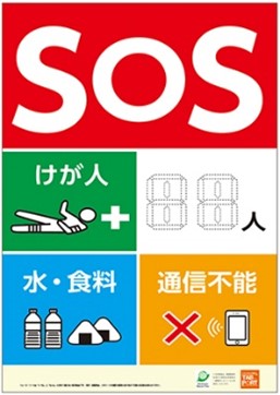 日常時は壁面装飾・掲示物のポスターやカレンダーとして、発災時は日常時に使っている面を裏返して窓面に貼りつける、もしくは安全な場所に貼り付けて外部に災害・救援情報を知らせるツールとなります。居宅内の垂直避難時・孤立時に。撥水シートなので、濡れても丈夫なうえ、水でふける筆記具が使えます。