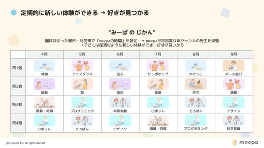 株式会社meepa(本社:神奈川県中郡二宮町、代表取締役CEO:山中健太郎)は、新渡戸文化子ども園(東京都中野区、理事長:平岩国泰)において、2023年11月から2024年2月にかけて約40人の年長児童に対してプレ導入された「みーぱのじかん」を2024年下期に本格導入します。年長児童に対する多様な体験レッスンを提供し、学園全体の教育目標である「Happiness Creator(自分も他人もしあわせにできる力を創造する/幸せをつくる人になる)」に基づき、子どもたちの自己肯定感や非認知能力の育成に取り組みます。