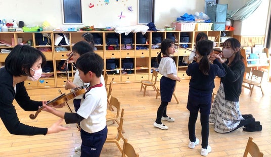 楽器体験では、講師の生演奏に集中して聴き入る姿が見られ、合唱のレッスン後には朝会での歌声や歌い方に大きな変化が現れました。
