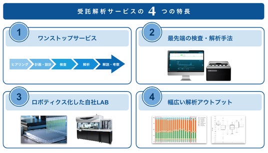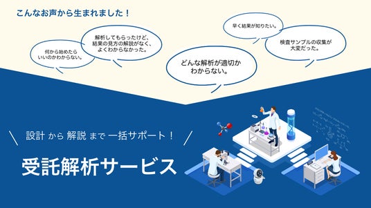 当社では、自社LAB・解析研究員、検査研究員をワンストップで抱えるからこそ、言われたことをやる単なる解析業務の外注作業ということではなく、お客様のやりたいことに寄り添った、成果伴走型の解析サービスのスタートに踏み切りました。ご利用になる目的に合わせて、解析方法の選択や検体数などの設計から解説まで一括サポートいたします。