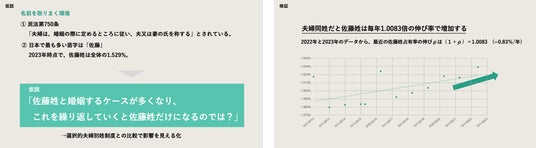 日本は世界で唯一、夫婦が同じ名字にしなくてはいけません。毎年50万組が結婚し、夫婦同姓により毎年50万の名字がなくなっています。13万種類あった苗字の種類も、現在の仕組みが続いた場合、“徐々に名字の種類が減少し、やがて1つの名字になってしまうのではないか”という仮説が生まれました。日本で最も多い名字は「佐藤」であり、2023年時点で、佐藤姓は国民全体の1.529%といわれています。